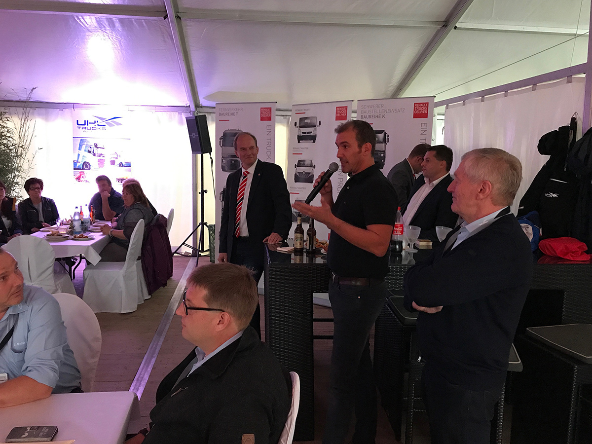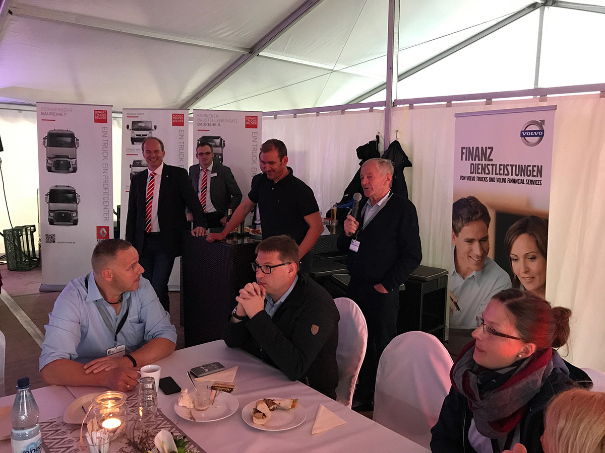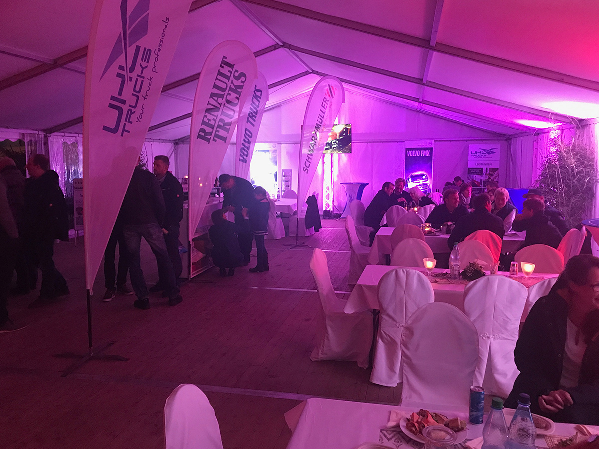Ein Highlight war unser Standabend am Freitag. Nachdem Carsten und Reimer Uhl den Abend eröffneten, begrüßten Christian Coolsaet (CEO & Vice President Volvo Group Trucks Central Europe) und Michael Weigand (CSO Schwarzmüller Gruppe) unsere Gäste und standen im Anschluss für interessante Gespräche bereit.