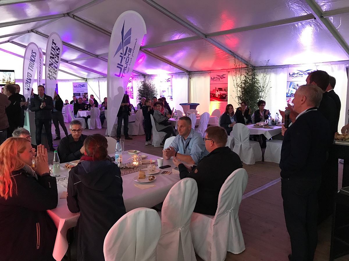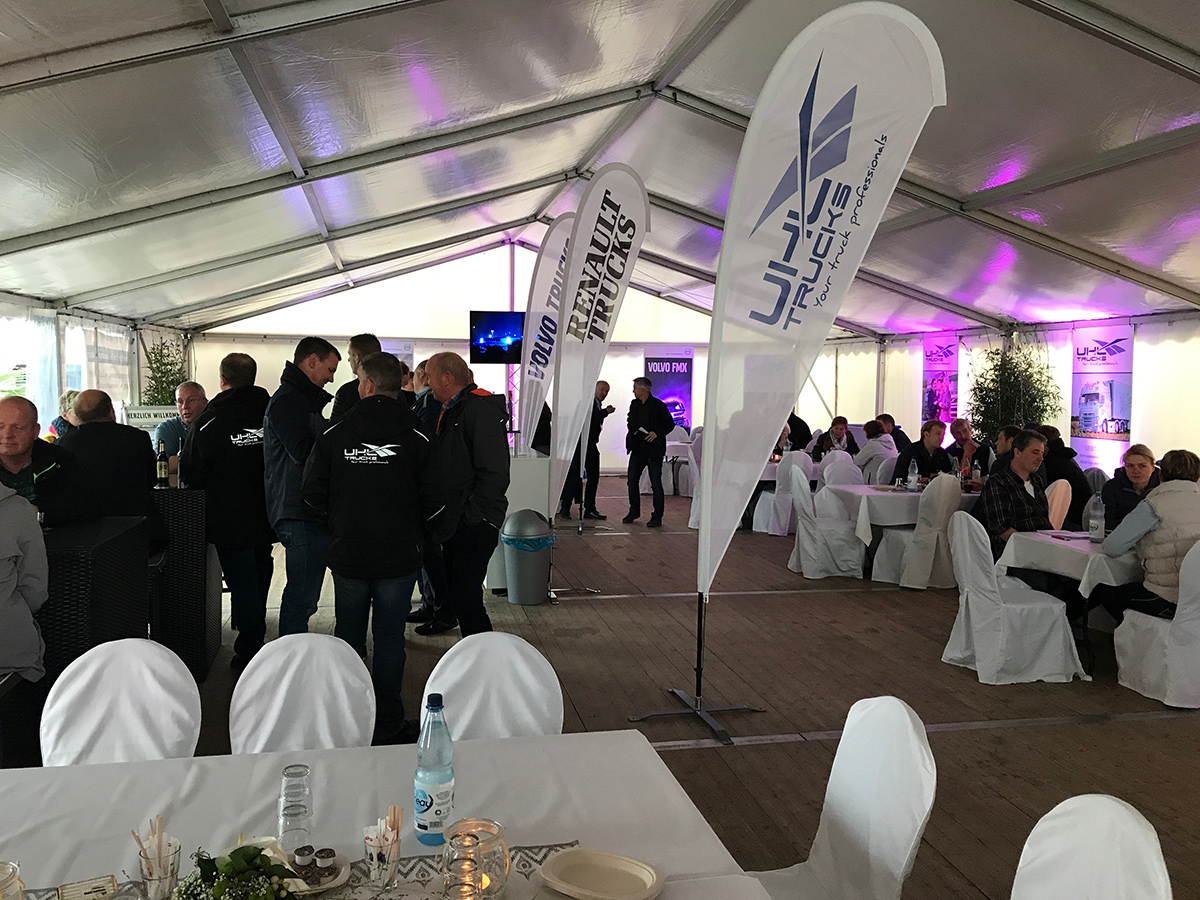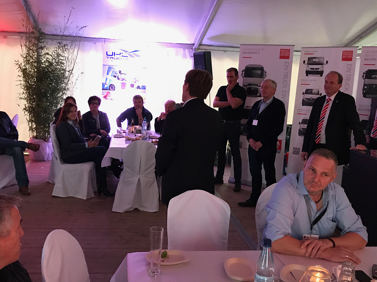 Ein Highlight war unser Standabend am Freitag. Nachdem Carsten und Reimer Uhl den Abend eröffneten, begrüßten Christian Coolsaet (CEO & Vice President Volvo Group Trucks Central Europe) und Michael Weigand (CSO Schwarzmüller Gruppe) unsere Gäste und standen im Anschluss für interessante Gespräche bereit.