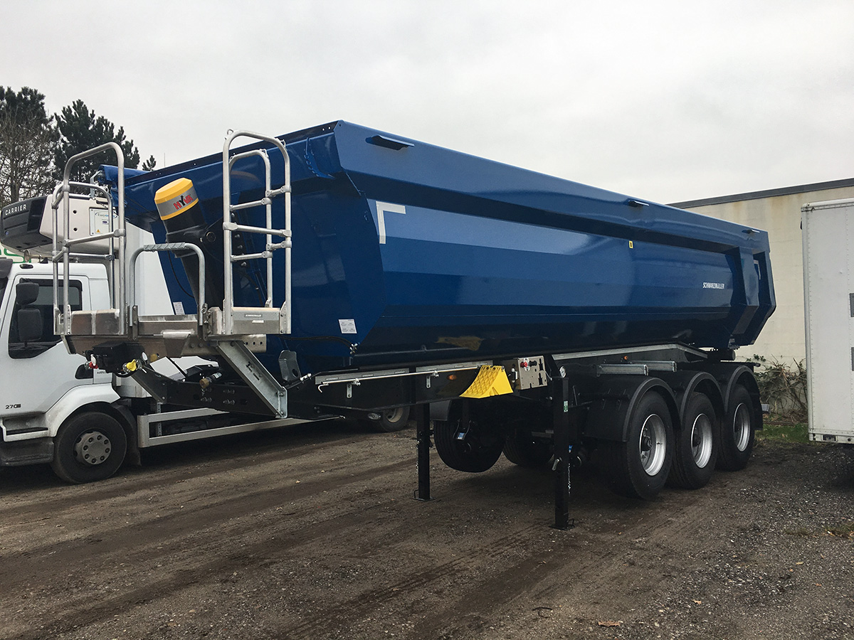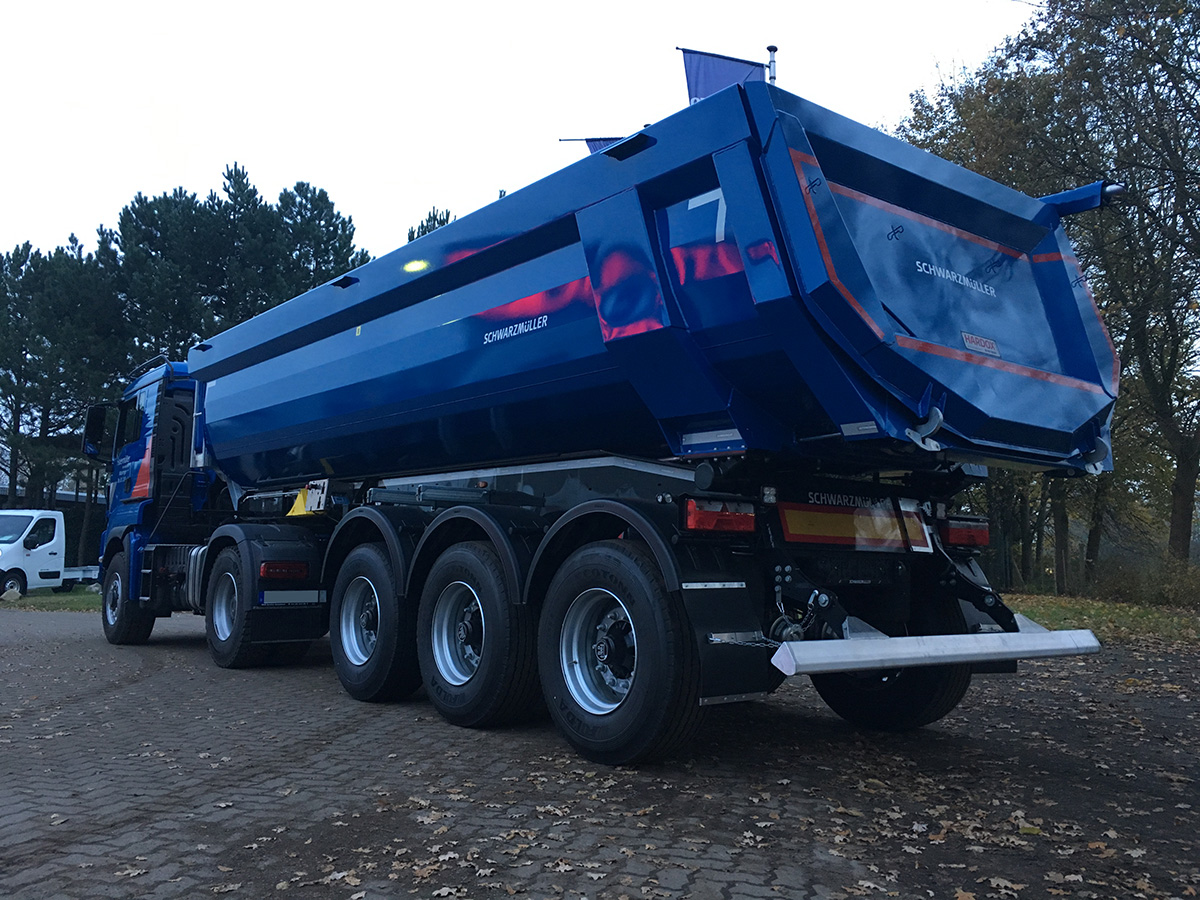 Auslieferung 3-Achs Schwarzmüller Stahl-Mulde mit 25m³ mit anliegender Rückwand, Liftachse, Rollplane, Besen Schaufelhalterung, Hub-Senk Einrichtung