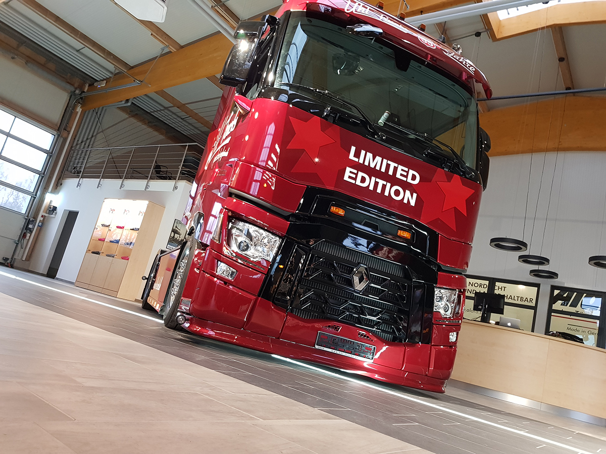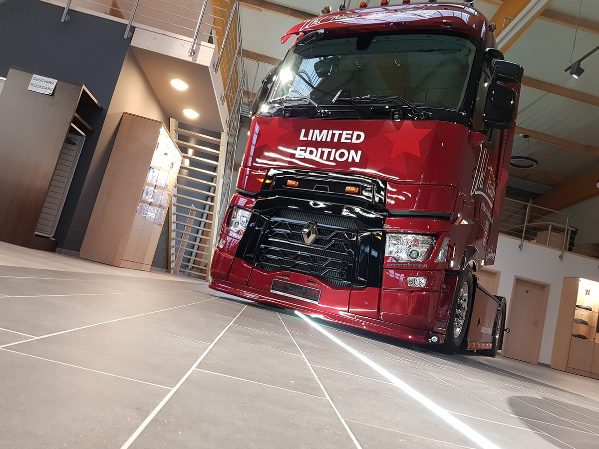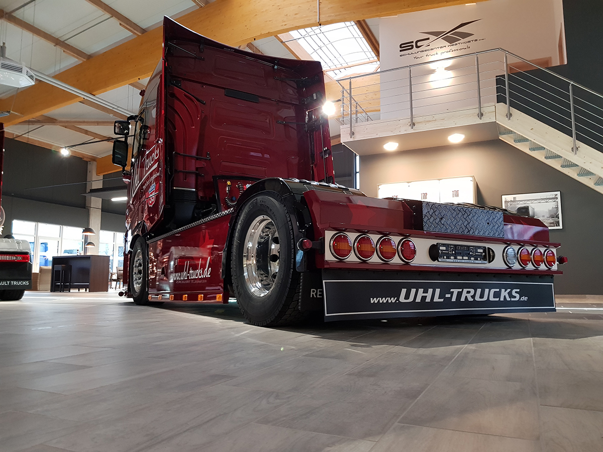Rahmen- und Seitenverkleidung, Standlichter in Seitenverkleidungen, Heckstoßstange mit Rund-LED-Lichtern und Positionsleuchten, Lackierung aller Anbauteile, Beschriftung im Jubiläumsstyle, Lufthörner, 3x Intertruckleuchten auf dem Dach, Double-Dutch-Leuchten in der Wartungsklappe, Positionsleuchten im angepassten Frontspoiler, Galgen