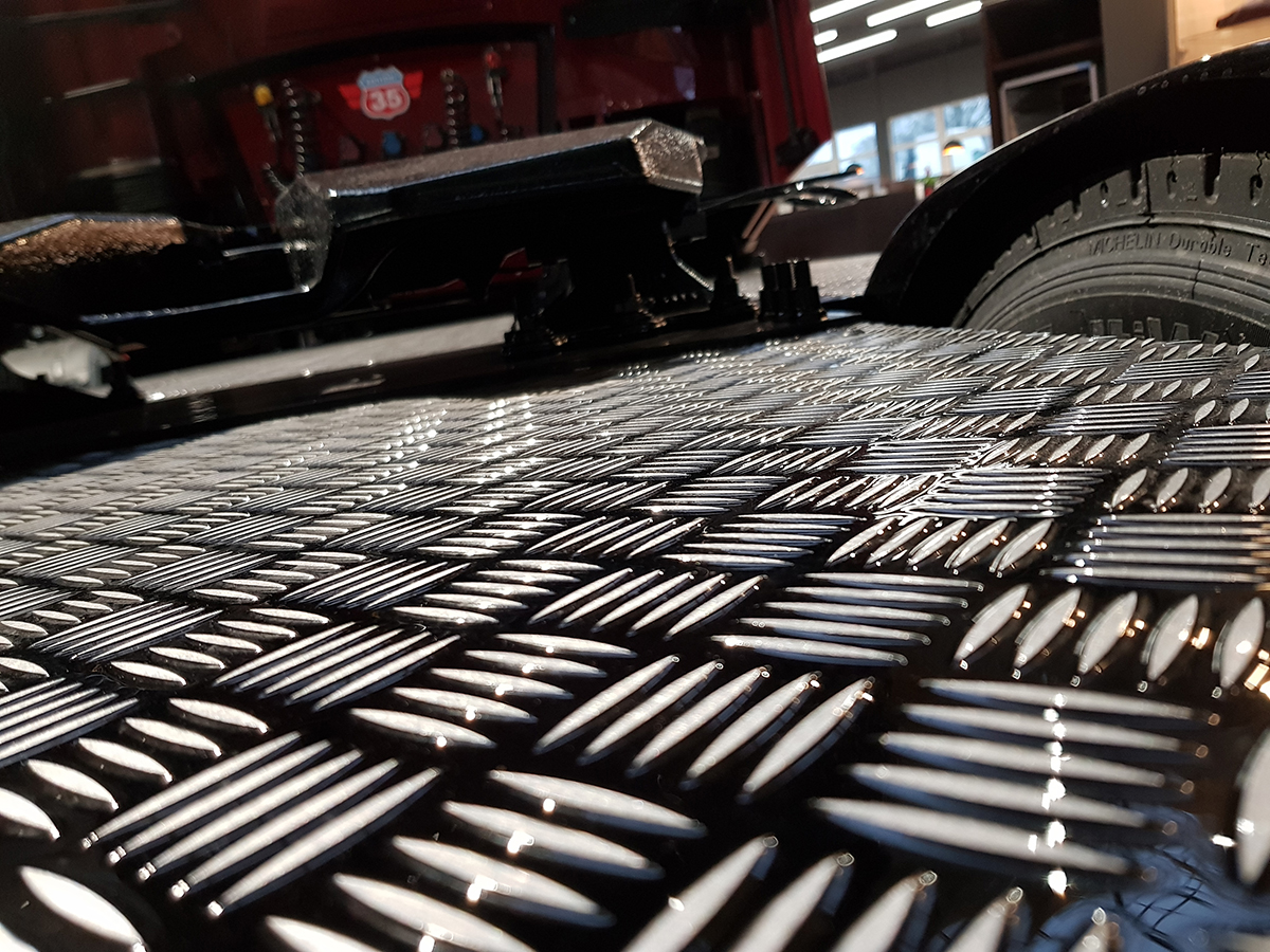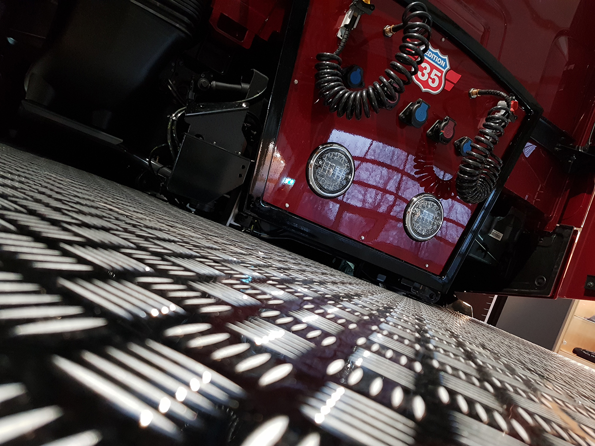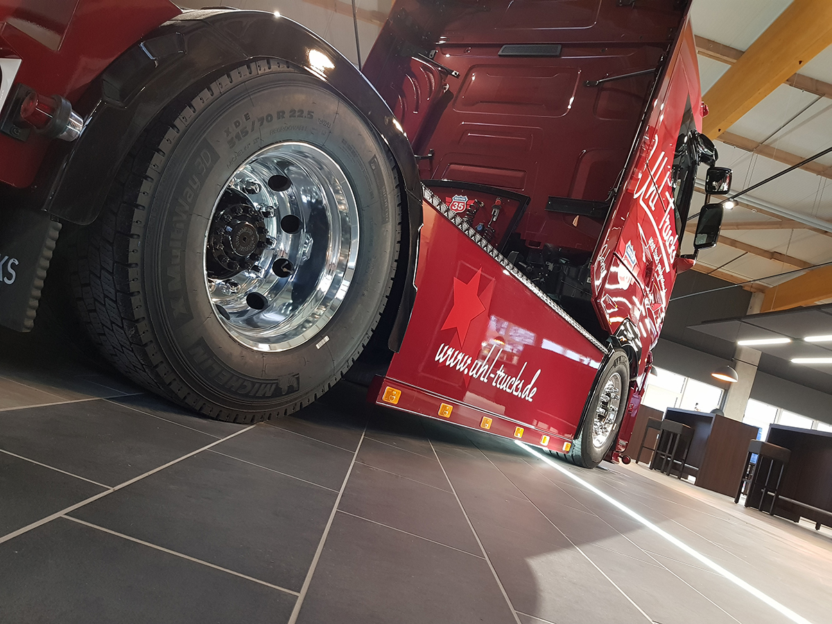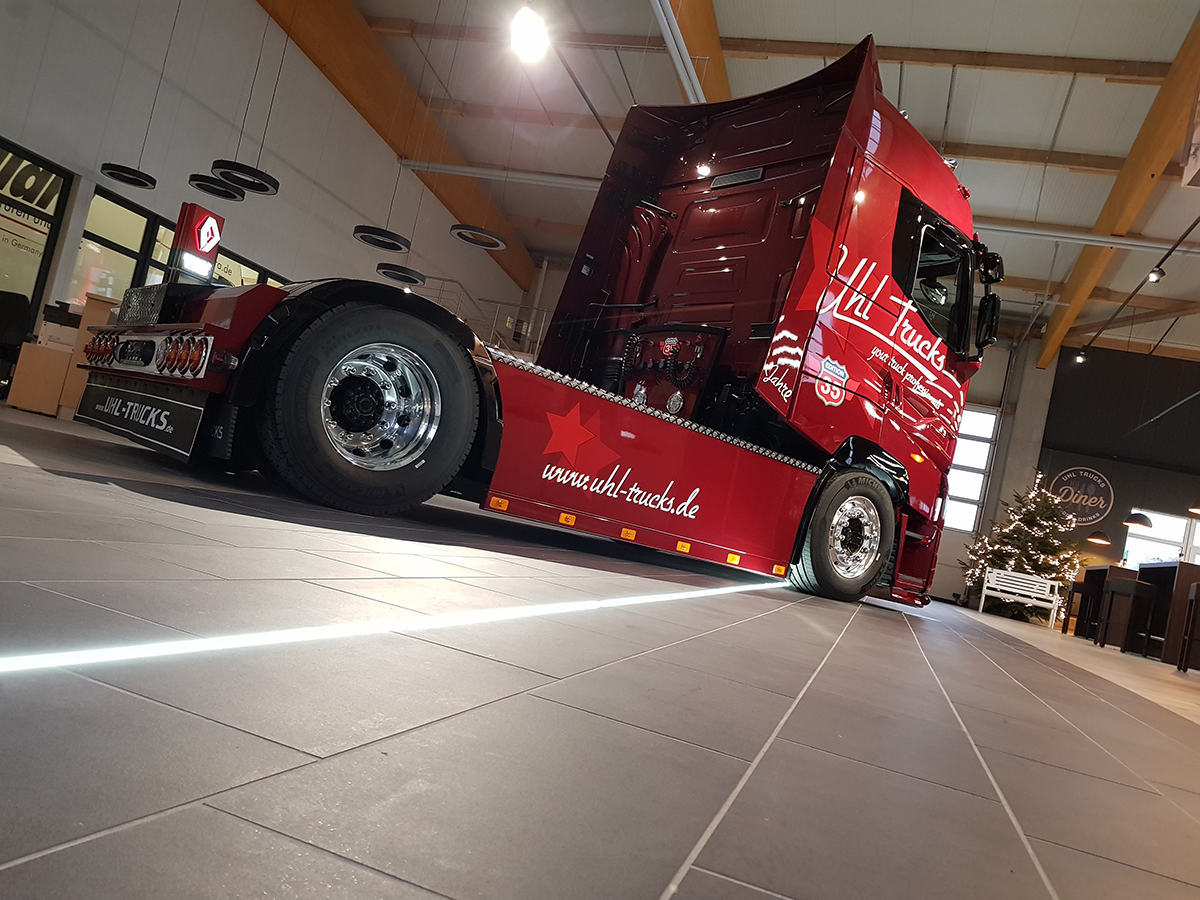 Rahmen- und Seitenverkleidung, Standlichter in Seitenverkleidungen, Heckstoßstange mit Rund-LED-Lichtern und Positionsleuchten, Lackierung aller Anbauteile, Beschriftung im Jubiläumsstyle, Lufthörner, 3x Intertruckleuchten auf dem Dach, Double-Dutch-Leuchten in der Wartungsklappe, Positionsleuchten im angepassten Frontspoiler, Galgen